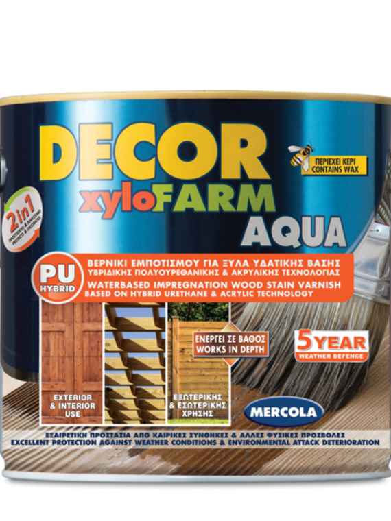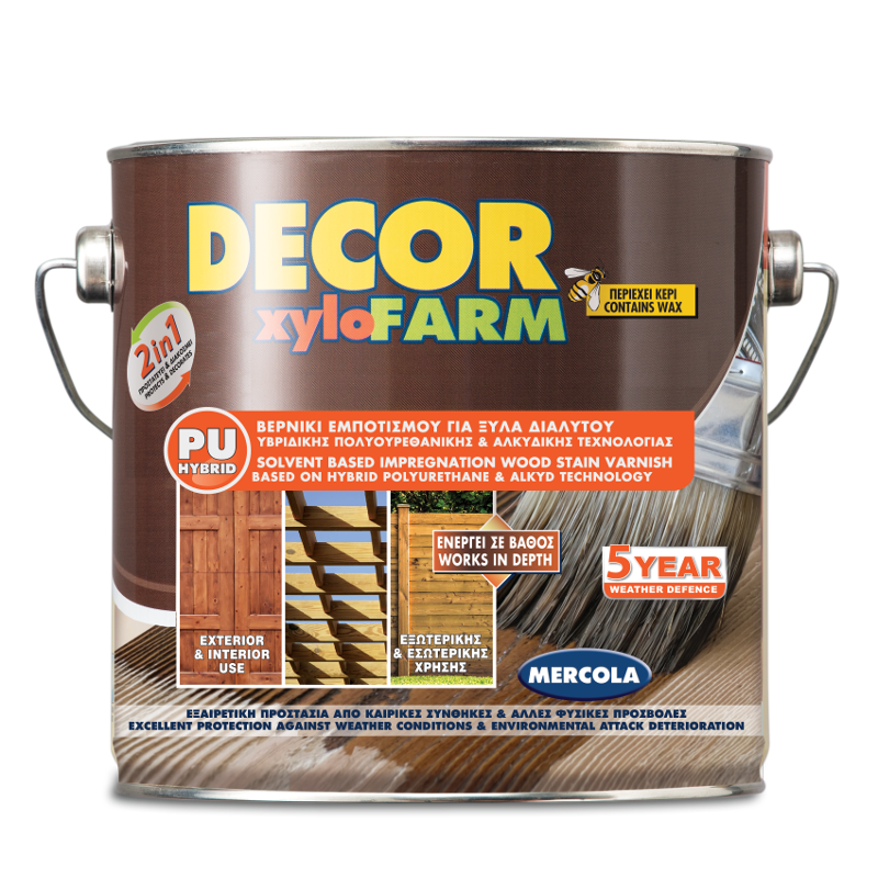 Το DÉCOR XYLOFARM είναι ρητινούχο προστατευτικό βερνίκι εμποτισμού για ξύλα, νέας υβριδικής τεχνολογίας πολυουρεθανικών και αλκυδικών ρητινών διαλύτου. Η ειδική του σύνθεση με μείγμα κεριών και ειδικών ρητινών νέας τεχνολογίας επιτρέπουν την διείσδυση του βαθιά στο ξύλο για εξαιρετική προστασία από προσβολές του περιβάλλοντος. Περιέχει φίλτρα UV για αποτελεσματική προστασία από την ηλιακή ακτινοβολία. Είναι υδροαπωθητικό, αποτρέπει το μαύρισμα και την αποσάθρωση του ξύλου. Δεν ξεφλουδίζει, δεν σπάει με αποτέλεσμα να μην χρειάζεται τρίψιμο. Δεν φουσκώνει χάρη στη μεγάλη του ελαστικότητα που ακολουθεί τις συστολές και διαστολές του ξύλου. Προσφέρει αποτελεσματική προστασία από όλες τις καιρικές συνθήκες τονίζοντας ταυτόχρονα τη φυσική ομορφιά του ξύλου. Λόγω της σύνθεσής του προστατεύει το στεγνό υμένα από την ανάπτυξη μυκήτων ιδιαίτερα σε επιφάνειες που εκτίθενται σε υψηλά επίπεδα υγρασίας ή/και σε αντίξοες καιρικές συνθήκες. Είναι κατάλληλο για εσωτερική και εξωτερική χρήση. Διατίθεται σε διαφανές και σε πολλές φυσικές αποχρώσεις.